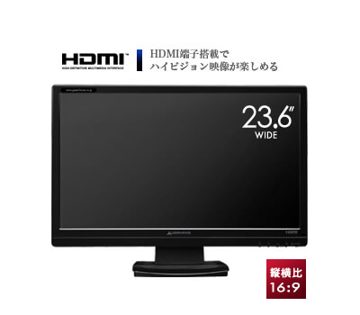 「GH-JEH243SHB」は、電源、スピーカーを内蔵したHDMI端子搭載の24bitフルカラー、23.6型ワイド液晶ディスプレイです。縦横比16:9パネルを採用し、16:9のコンテンツの表示は黒帯部分なしで画面にフル表示させることができ、1677万色フルカラー表示とDCE機能ON時にはコントラスト比100000:1の高画質で、くっきりと見易い画像表示を実現します。