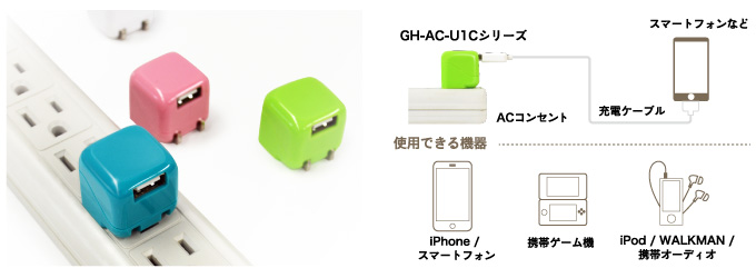 ACコンセントからiPhoneやスマートフォン、携帯型ゲーム機などのUSB充電対応機器を充電できる、小さくてかわいいキューブ形のAC充電器です。パソコンのUSBポートを使用しなくても、iPhoneやスマートフォンに付属する充電用USBケーブルと組み合わせることで、直接ACコンセントからiPhoneやスマートフォンの充電が可能になります。