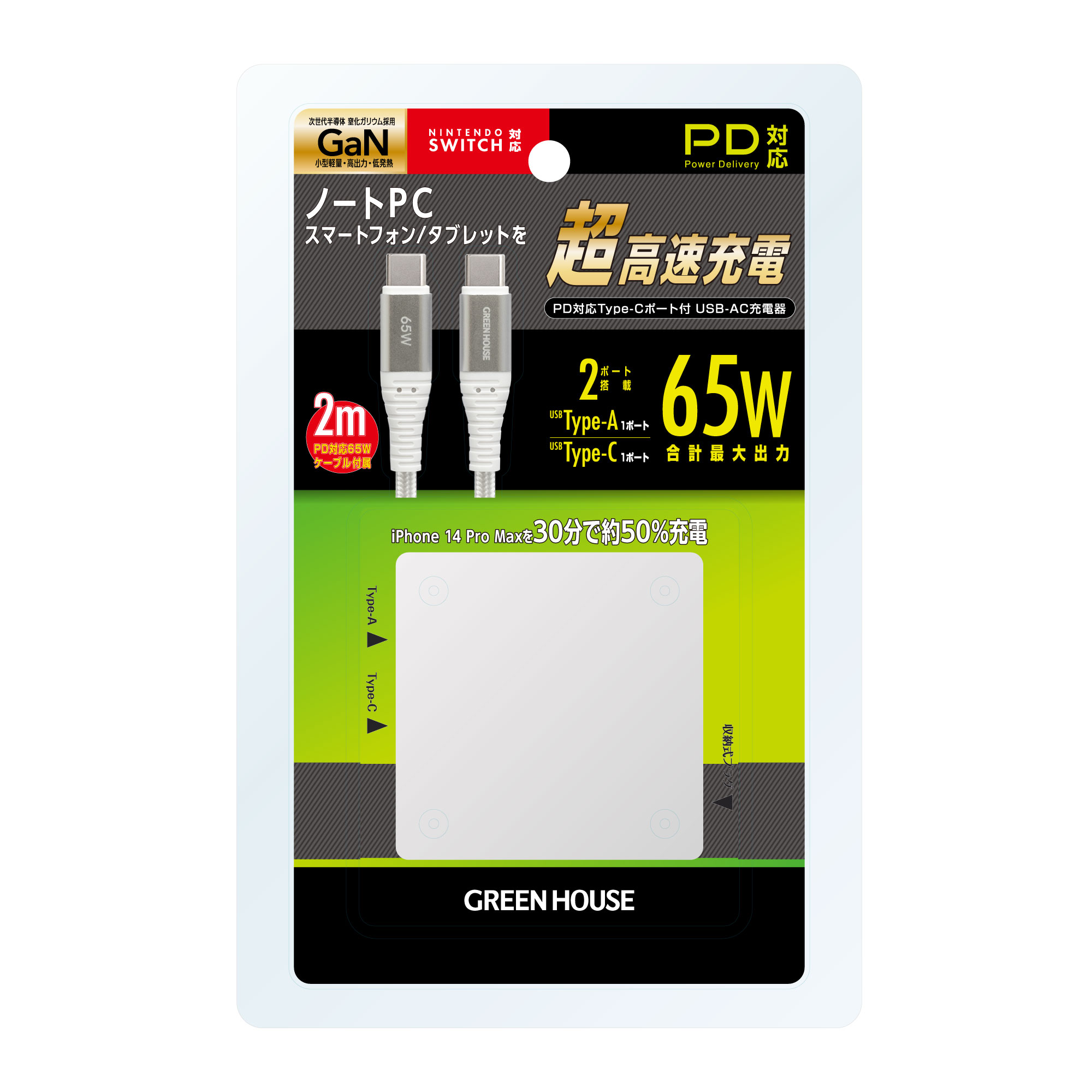 65W高出力対応のUSB Type-C to C強靭ケーブル(2m)が付属しており、あらためて高出力に対応した充電ケーブルを購入する必要が無く、すぐに超高速充電を体験できます。
