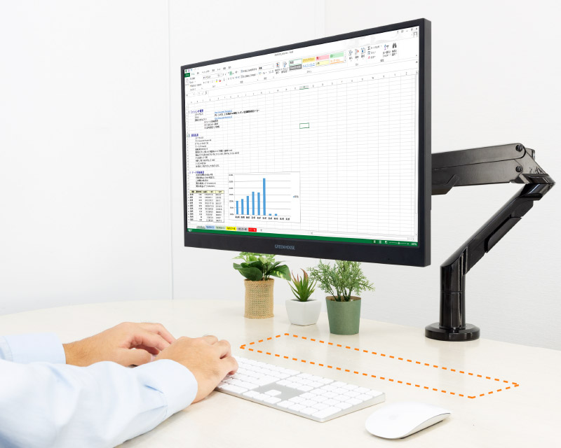 液晶ディスプレイの台座(スタンド)がなくなって、デスク上すっきり!液晶画面をお好みの位置に設置できるので、作業効率が上がります。
