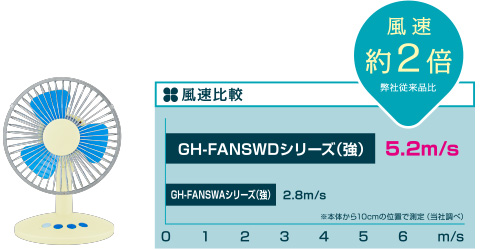 風速5.2m/sと、当社従来製品(2.8m/s)に比べて約2倍も強力な風を送ります。