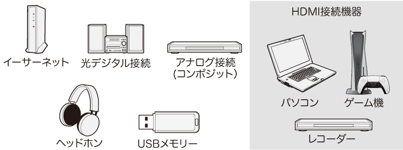 | 入力端子 | コンポジットビデオ入力(映像入力用×1、ステレオ音声用×2) HDMI×3(HDR10対応) LAN端子×1 USB2.0端子×2 |