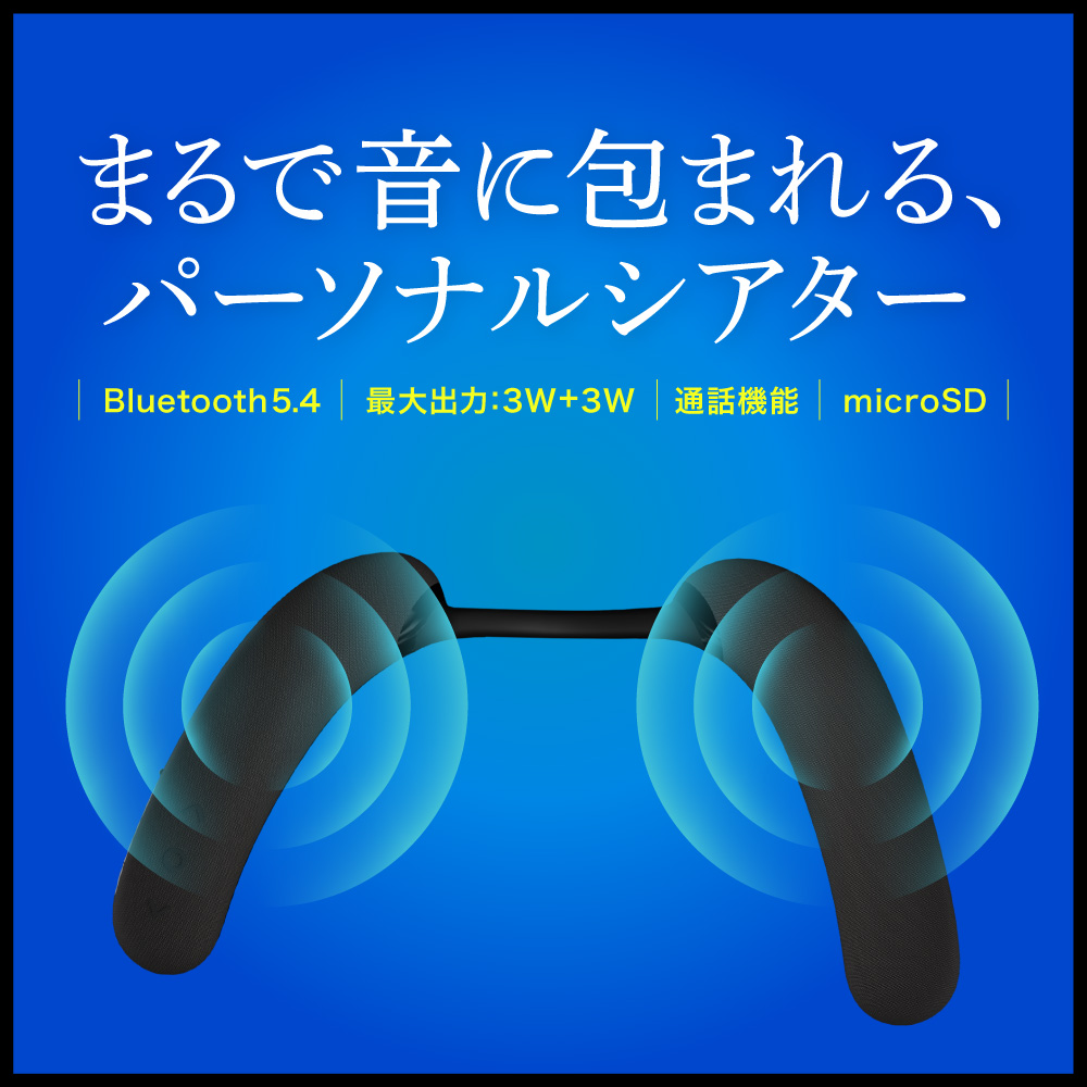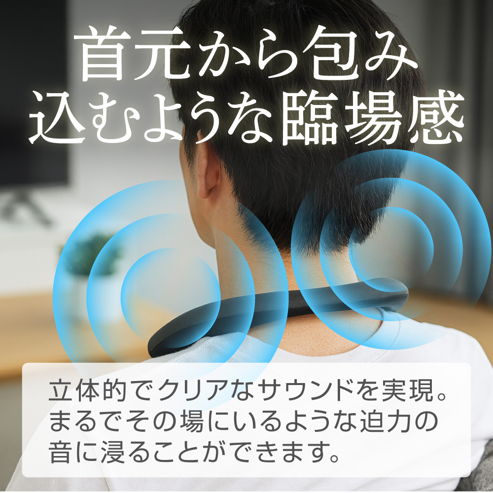 首元にスピーカーを配置することで、パーソナルな音場を作り出し、まるでその場にいるかのような迫力のクリアなサウンドを楽しめます。