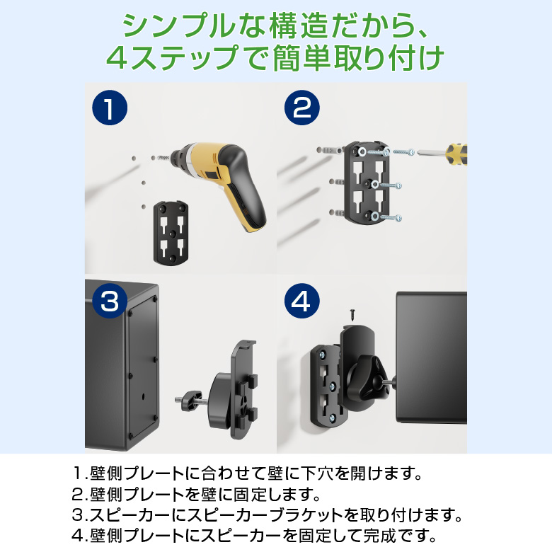 | 対応スピーカー | 本体裏面に以下のいずれかのネジ穴が開いていること。 ・UNC 1/4-20ネジ ・M4~M6ネジ ・奥行き5mm以上のM6サイズのキーホール |